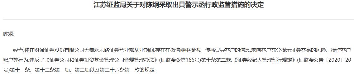 江苏证监局指出,财通证券员工陈炯在无锡永乐路证券营业部从业期间,存在在微信群中提供、传播误导客户的信息,未向客户充分提示证券交易的风险、操作客户账户等行为。