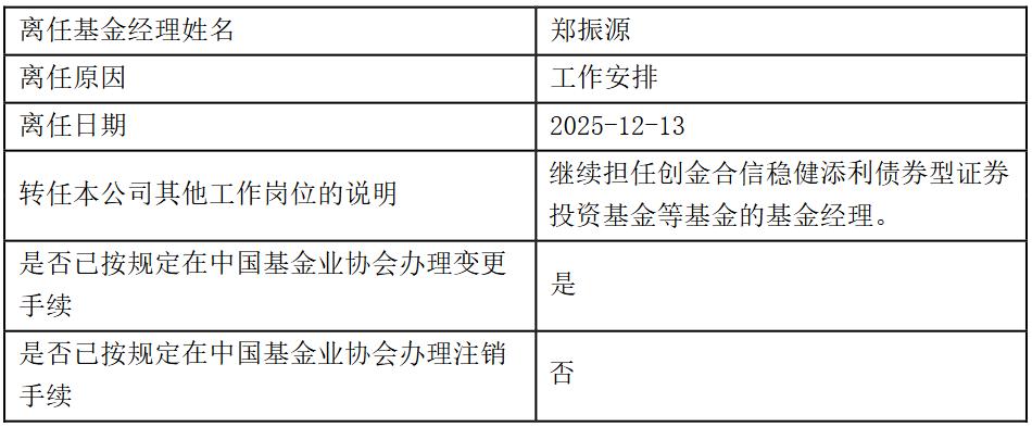 12月13日,创金合信基金发布公告称,基金经理郑振源因工作安排离任创金合信中债1-3年国开债基金、创金合信尊泰纯债债券基金;基金经理闫一帆离任创金合信季安盈3个月持有期债券基金、创金合信泰享39个月基金。