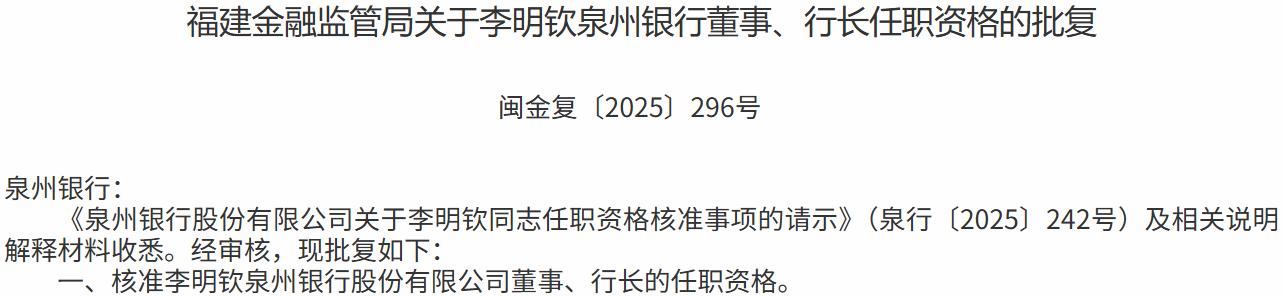 12月15日,福建金融监管局发布关于李明钦泉州银行董事、行长任职资格的批复,核准李明钦泉州银行股份有限公司董事、行长的任职资格。