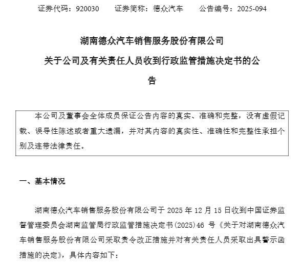 近日,湖南德众汽车销售服务股份有限公司(以下简称“德众汽车”)发布公告称,该公司及相关责任人员收到了中国证券监督管理委员会湖南监管局出具的《行政监管措施决定书》,因多项违规行为,德众汽车被责令改正,实际控制人段坤良及董秘易斈播被出具警示函。