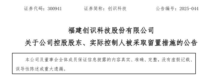 12月22日,创识科技(300941.SZ)发布公告称,近日收到邹平市监察委员会签发的《立案通知书》和《留置通知书》,控股股东、实控人张更生被立案调查并实施留置措施。