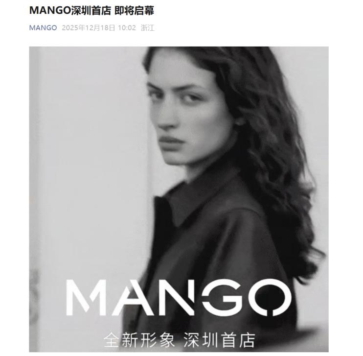 12月18日,MANGO微信公众号发文称,深圳首店即将启幕。