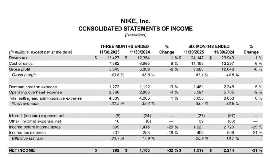 12月19日,耐克公布了2026财年第二季度财报。本季度耐克实现营业收入124.27亿美元,同比增长1%;实现净利润7.91亿元,同比减少32%。