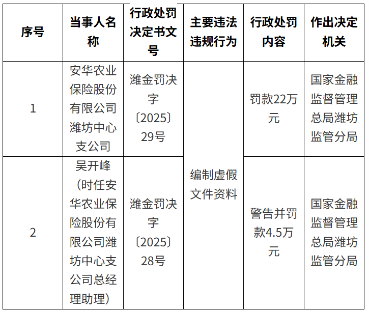 12月16日,国家金融监督管理总局潍坊监管分局披露的行政处罚信息公开表显示,安华农业保险股份有限公司(以下简称“安华农险”)潍坊中心支公司因编制虚假文件资料被罚款22万元。同时,时任安华农险潍坊中心支公司总经理助理吴开峰被警告并被罚款4.5万元。