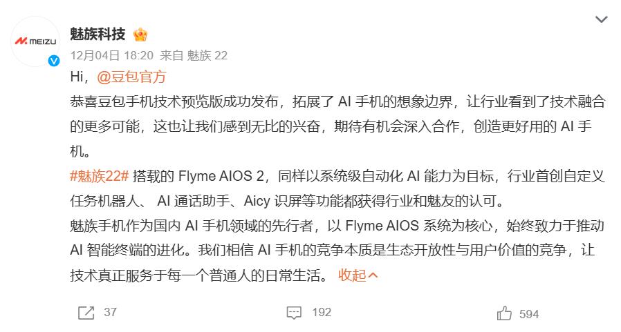 近日,魅族科技官方微博公开恭喜豆包手机技术预览版成功发布,称该产品让行业看到了AI与手机融合的更多可能性,言语间难掩兴奋,同时明确表达了期待深入合作共创更好用AI手机的意愿。