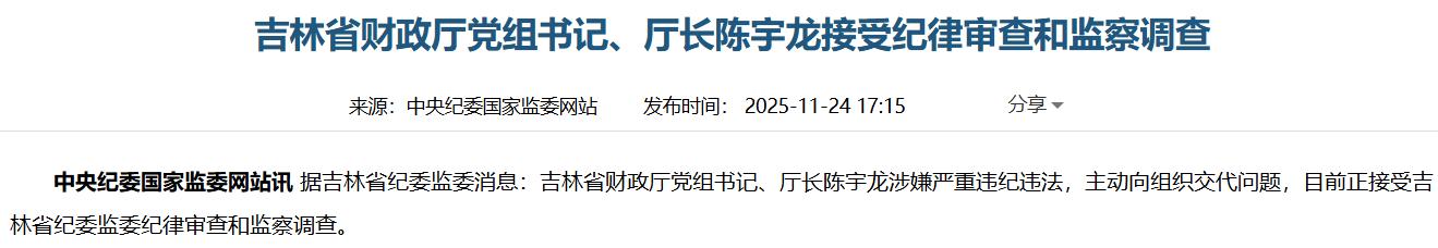 值得注意的是,11月24日,据吉林省纪委监委消息,吉林省财政厅党组书记、厅长陈宇龙涉嫌严重违纪违法,主动向组织交代问题,目前正接受吉林省纪委监委纪律审查和监察调查。