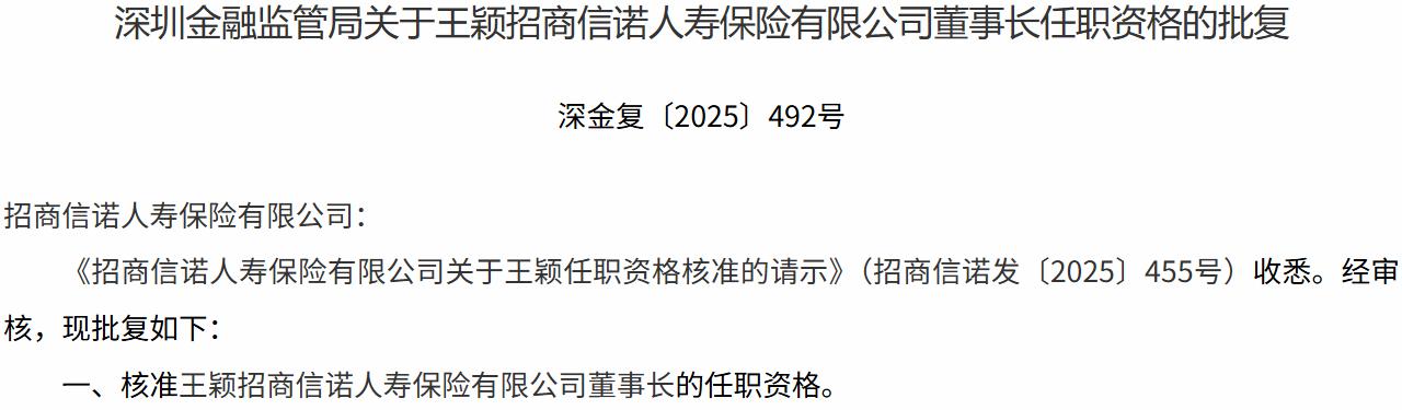 12月19日,深圳金融监管局发布关于王颖招商信诺人寿保险有限公司(以下简称“招商信诺人寿”)董事长任职资格的批复,核准王颖招商信诺人寿董事长的任职资格。