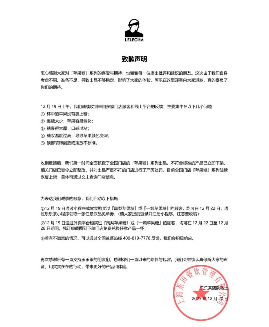 面对大量负面反馈,乐乐茶于12月20日晚间紧急发布致歉声明。声明中,乐乐茶将问题归因于自身“考虑不周、准备不足”,导致全国各门店的“苹果糖”系列产品出品极不稳定。