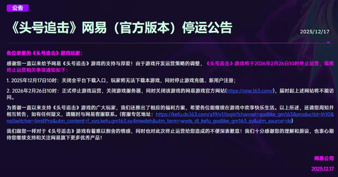 公告显示,2025年12月17日10时,《头号追击》的全平台下载入口将被关闭,玩家将无法下载该游戏,同时停止游戏充值、新用户注册;2026年2月26日10时,正式停止游戏运营,关闭游戏服务器,同时关闭该游戏的网易游戏官方网站,届时上述网站将不能访问。