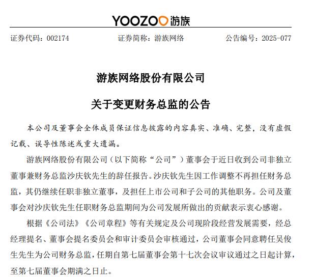 近日,游族网络股份有限公司(简称“游族网络”,002174.SZ))宣布,董事会收到非独立董事兼财务总监沙庆钦先生的辞任报告。因工作调整,沙庆钦不再担任财务总监,但继续任职非独立董事,及担任游族网络和子公司的其他职务。