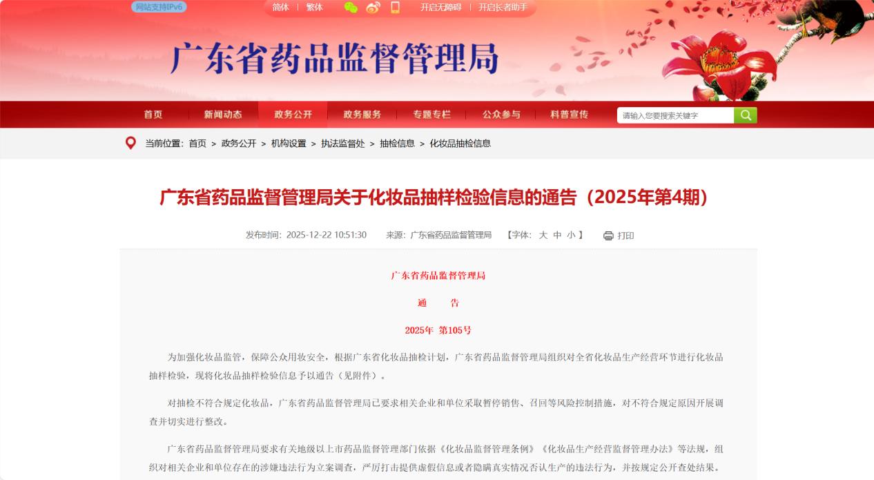 12月22日,广东省药品监督管理局官网发布了化妆品抽样检验信息的通告,此次总计抽检了750批次化妆品,有16批次化妆品不符合规定。其中,两款喷雾均因菌落总数超标导致不合格。