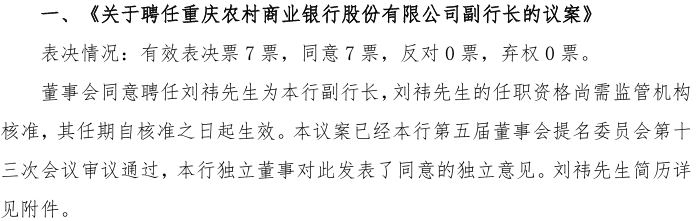 12月23日,渝农商行召开了第五届董事会第六十六次会议,审议通过了《关于聘任重庆农村商业银行股份有限公司副行长的议案》,董事会同意聘任刘祎为该行副行长,刘祎的任职资格尚需监管机构核准,其任期自核准之日起生效。
