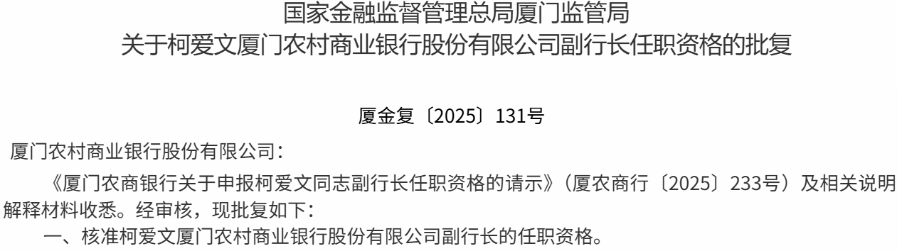 12月23日,国家金融监督管理总局厦门监管局发布批复,核准柯爱文厦门农村商业银行股份有限公司(以下简称“厦门农商行”)副行长的任职资格。