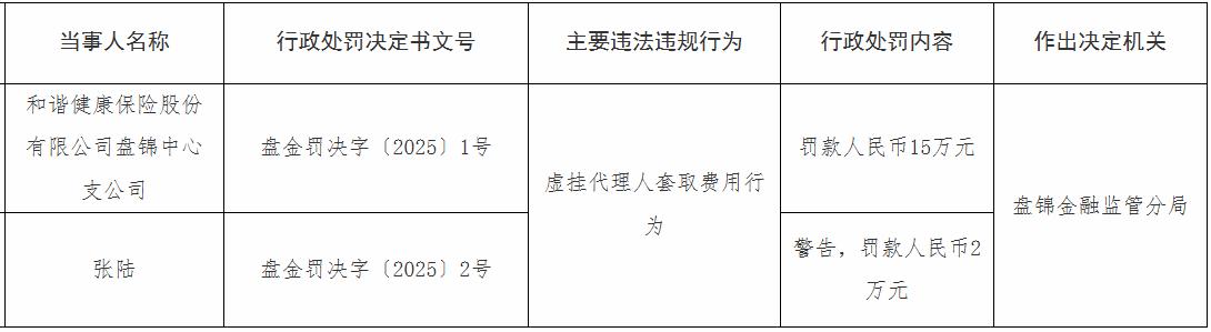 12月25日,盘锦金融监管分局披露的行政处罚信息公开表显示,和谐健康保险股份有限公司(以下简称“和谐健康保险”)盘锦中心支公司因存在虚挂代理人套取费用行为,被罚款15万元,相关责任人张陆被警告并被罚款2万元。