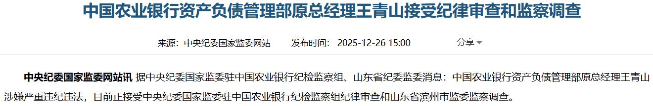 2025年12月26日,据中央纪委国家监委驻中国农业银行纪检监察组、山东省纪委监委消息,中国农业银行资产负债管理部原总经理王青山涉嫌严重违纪违法,目前正接受中央纪委国家监委驻中国农业银行纪检监察组纪律审查和山东省滨州市监委监察调查。