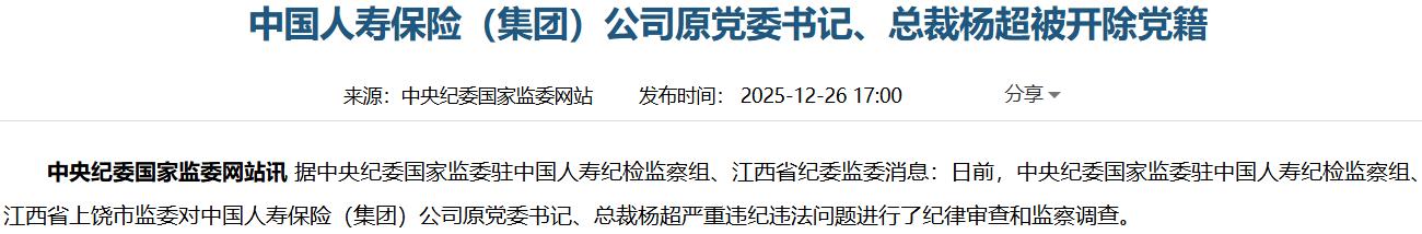 2025年12月26日,据中央纪委国家监委驻中国人寿纪检监察组、江西省纪委监委消息,日前,中央纪委国家监委驻中国人寿纪检监察组、江西省上饶市监委对中国人寿保险(集团)公司原党委书记、总裁杨超严重违纪违法问题进行了纪律审查和监察调查。