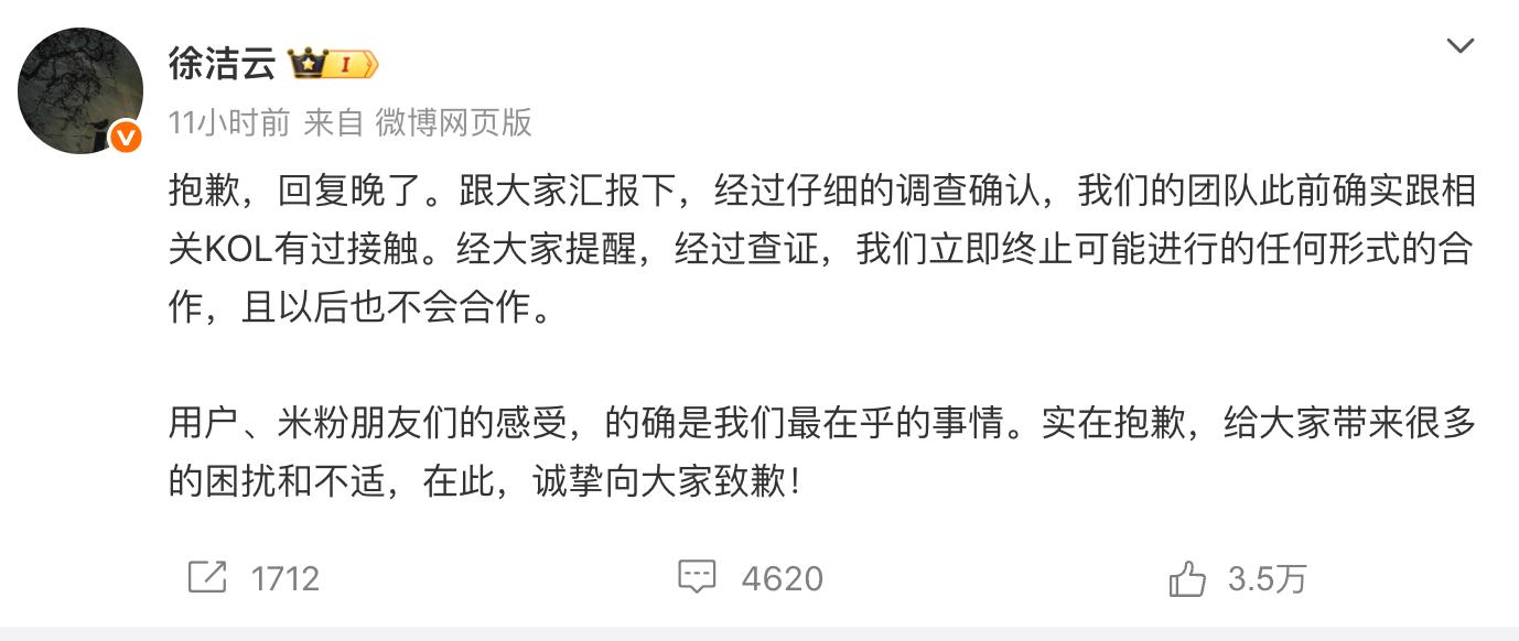 1月5日晚,小米集团董事长特别助理、战略市场部副总经理徐洁云通过微博致歉,“经过仔细的调查确认,我们的团队此前确实跟相关KOL有过接触。经大家提醒,经过查证,我们立即终止可能进行的任何形式的合作,且以后也不会合作”。