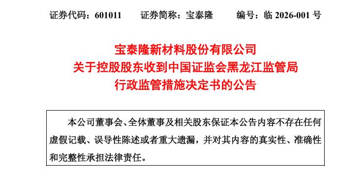 2026年1月6日,宝泰隆新材料股份有限公司(以下简称“宝泰隆”,601011.SH)发布公告称,控股股东宝泰隆集团收到中国证监会黑龙江监管局行政监管措施决定书。