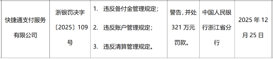 2025年12月31日,中国人民银行浙江省分行发布的行政处罚决定信息公示表显示,快捷通支付服务有限公司(以下简称“快捷通支付”)因违反备付金管理规定、违反账户管理规定、违反清算管理规定,被警告并被处以罚款321万元,相关责任人沈某、严某被警告并被处以罚款8万元。