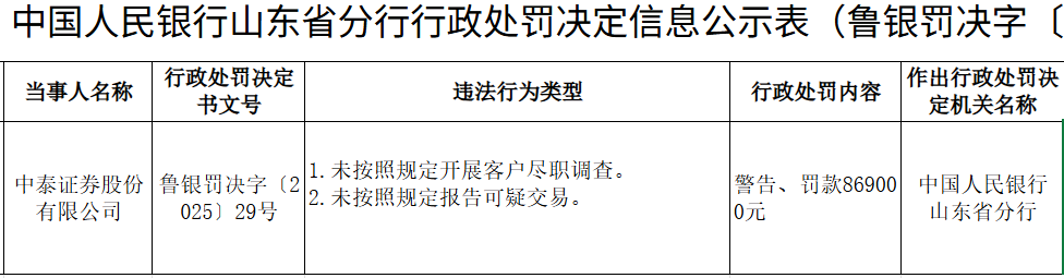2025年12月31日,中国人民银行山东省分行发布的行政处罚决定信息公示表显示,中泰证券因未按照规定开展客户尽职调查、未按照规定报告可疑交易,被警告并被罚款86.90万元。