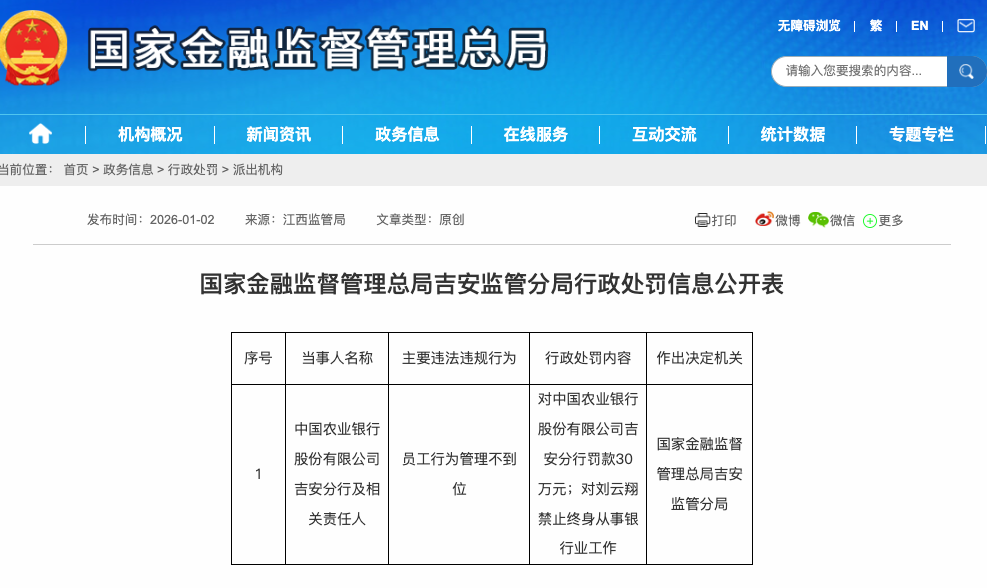 1月2日,由于员工行为管理不到位,中国农业银行吉安分行被国家金融监督管理总局吉安监管分局罚款30万元,刘云翔被禁止终身从事银行业工作。