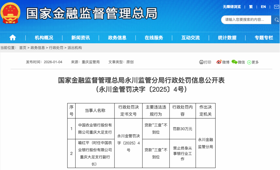 1月4日,中国农业银行重庆大足支行由于贷款“三查”不到位被国家金融监督管理总局永川监管分局罚款30万元,时任大足支行副行长喻红平被禁止终身从事银行业工作。