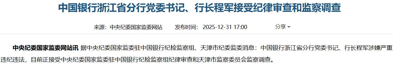 2025年12月31日,据中央纪委国家监委驻中国银行纪检监察组、天津市纪委监委消息,中国银行浙江省分行党委书记、行长程军涉嫌严重违纪违法,目前正接受中央纪委国家监委驻中国银行纪检监察组纪律审查和天津市监察委员会监察调查。