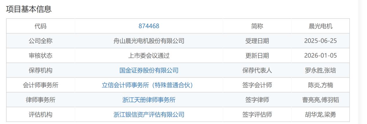 近日,舟山晨光电机股份有限公司(以下简称“晨光电机”)北交所IPO审核状态更新为“上市委会议通过”。