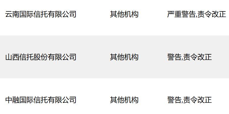 云南信托山西信托中融信托等三家信托收到自律处分 均被警告责令改正