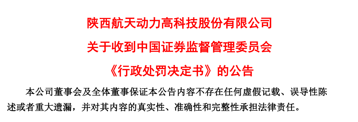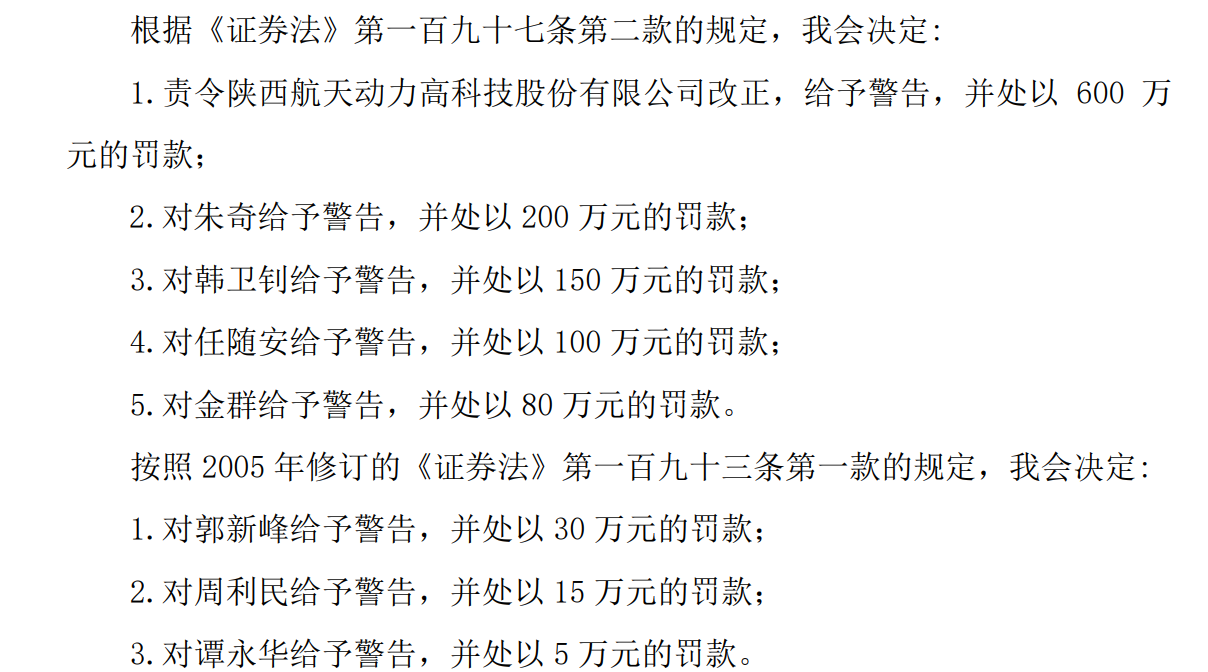 据《行政处罚决定书》,航天动力及朱奇、韩卫钊等相关责任人被警告,合计被罚款1180万元;时任董事、总经理郭新峰作为业务主要决策人,因行为恶劣、情节严重被采取10年证券市场禁入措施。