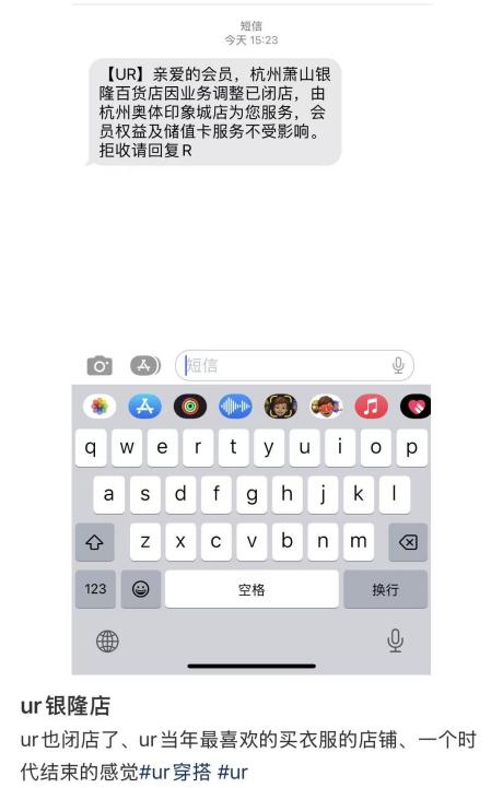 近日,有小红书网友发帖称,UR杭州萧山银隆百货店因业务调整已闭店,将由杭州奥体印象城店提供服务。