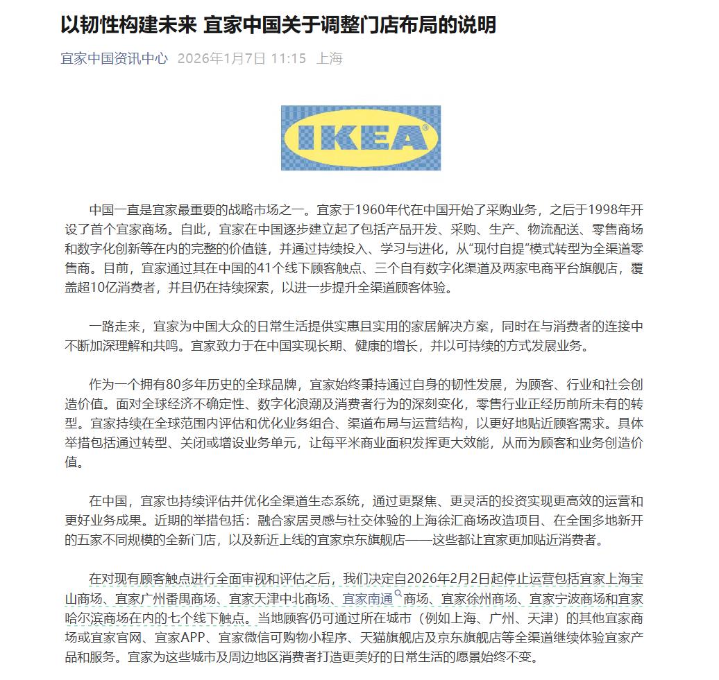 2026年1月7日,宜家中国资讯中心微信公众号发文称,在对现有顾客触点进行全面审视和评估之后,决定自2026年2月2日起停止运营包括宜家上海宝山商场、宜家广州番禺商场、宜家天津中北商场、宜家南通商场、宜家徐州商场、宜家宁波商场和宜家哈尔滨商场在内的七个线下触点。