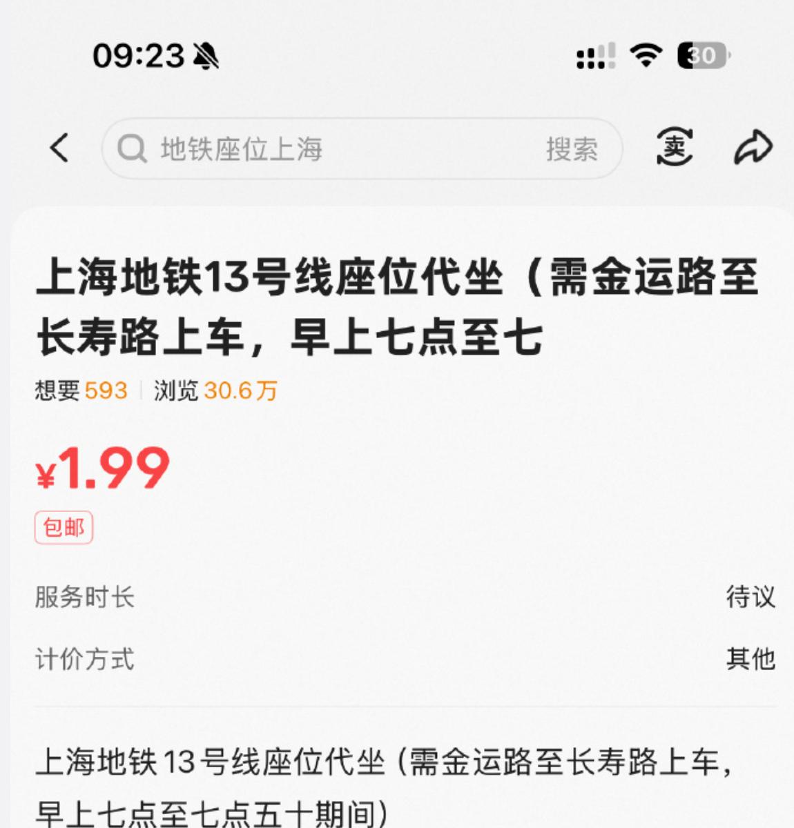 近日,有网友反映,在闲鱼平台上出现了提供上海地铁“代坐”服务的帖子,标价1.99元便可代占特定路段座位,此类服务帖子多集中在上海2、9、10号线等热门线路,发帖者大多自称从起点站附近上车,承诺为买家让座,交易通常通过微信私下完成,这一现象迅速引发广泛讨论。对此,闲鱼客服回应称,会高度重视该情况并转交相关部门核查处理。
