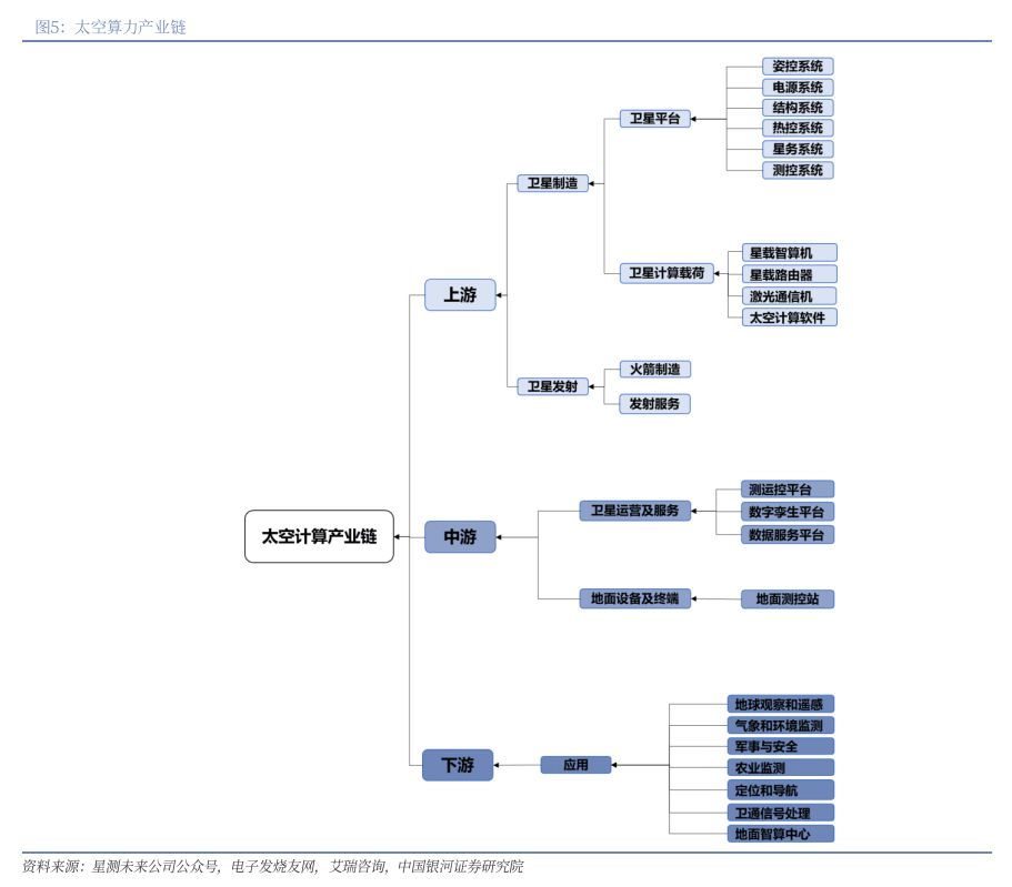 太空算力产业链可划分为上游制造与发射、中游运营与地面接入、下游数据赋能与场景落地三个核心环节。其中,在产业上游,卫星制造和计算载荷成为核心。中游环节主要由在轨运营管理系统与地面接入设施构成。下游覆盖范围由传统的遥感、导航、气象观测等领域,拓展至智慧城市、无人系统控制、边缘智能推理等高动态环境。