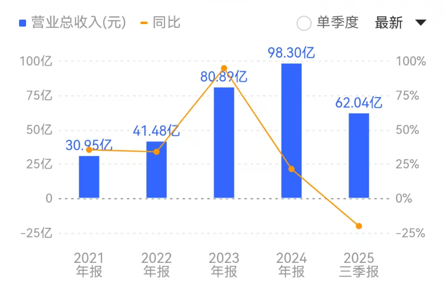 (迈为股份2021年到2025年Q3营业收入 来源:同花顺财经)