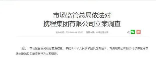 1月14日,国家市场监督管理总局宣布,根据前期核查,依据《中华人民共和国反垄断法》,对携程集团有限公司(下称“携程集团”)涉嫌滥用市场支配地位实施垄断行为立案调查。此消息迅速引发市场反应,携程集团当日股价大幅下跌。