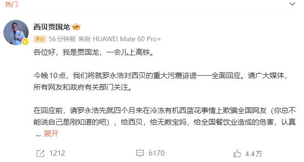 就在西贝将关闭102家门店事件余温尚存之际,1月16日晚,西贝董事长贾国龙在微博平台发文称,将在晚10点,就罗永浩对西贝的重大污蔑诽谤进行全面回应。
