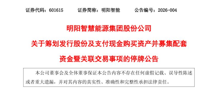 2026年1月12日,明阳智能(601615.SH)发布公告称,拟通过发行股份及支付现金方式收购中山德华芯片技术有限公司(以下简称“德华芯片”)控制权,并募集配套资金,本次交易构成关联交易。明阳智能股票自1月13日起开始停牌,预计停牌时间不超过10个交易日。