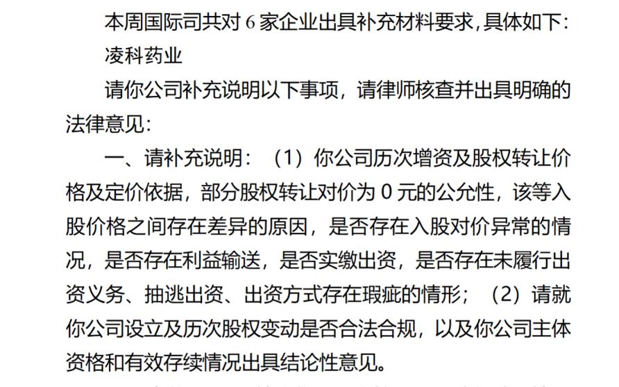 2026年1月19日,中国证监会发布的最新一期《境外发行上市备案补充材料要求》显示,凌科药业需补充说明历次增资及股权转让价格及定价依据、股权变动是否合法合规、无控股股东的认定依据、“突击入股”股东入股价格公允性、境外子公司涉及的境外投资等问题。