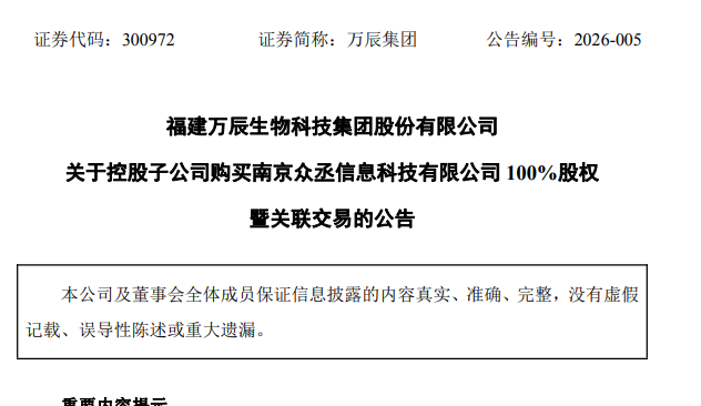 万辰集团公告显示,其控股子公司南京万丞信息科技有限公司,将以约5401.59万元的价格,收购江苏好再来电子商务有限公司持有的南京众丞信息科技有限公司100%股权。此次收购的核心目的并非拓展新业务,而是为了进一步完善其生鲜零售平台“新零帮”的相关知识产权布局。