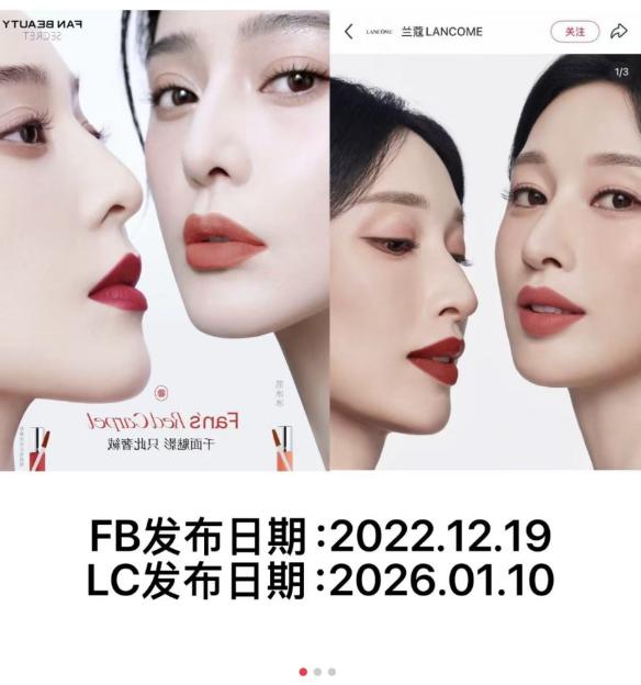 另外值得关注的是,兰蔻此次新品的主传播语为“解锁你的红毯绝色”,而Fan Beauty曾多次使用“红毯绝色”作为核心关键词。截至2026年1月16日,兰蔻尚未下架相关海报,也未进行正式回应。