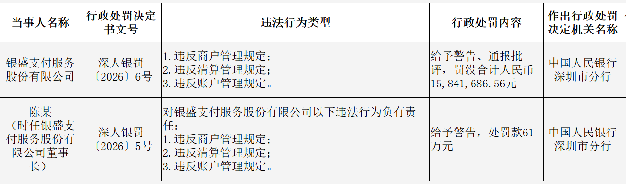 1月16日,中国人民银行深圳市分行公布的行政处罚决定信息公示表显示,银盛支付服务股份有限公司因违反商户管理规定、违反清算管理规定、违反账户管理规定,被给予警告、通报批评,并被罚没合计1584.17万元。时任银盛支付董事长的陈某被给予警告处分,并被处罚款61万元。