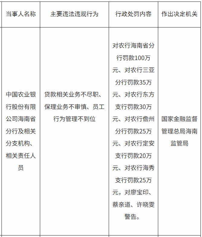 1月15日,国家金融监督管理总局海南监管局发布的行政处罚信息公开表显示,农业银行海南省分行及相关分支机构存在贷款相关业务不尽职、保理业务不审慎、员工行为管理不到位等违法违规行为,海南监管局对农行海南省分行罚款100万元,对农行三亚分行罚款35万元,对农行东方支行罚款30万元,对农行儋州分行罚款25万元,对农行定安支行罚款20万元,对农行海秀支行罚款25万元,对廖宝印、蔡亲道、许晓雯给予警告。