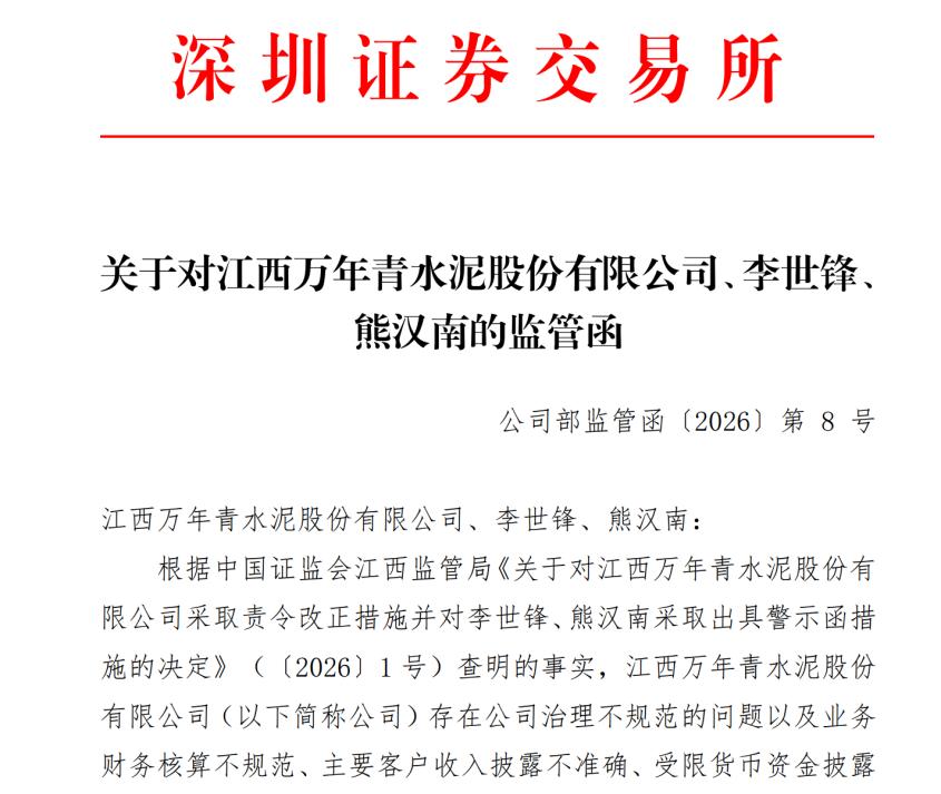 2026年1月23日,江西万年青水泥股份有限公司(以下简称“万年青”,000789.SZ)发布公告称,根据中国证监会江西监管局《关于对江西万年青水泥股份有限公司采取责令改正措施并对李世锋、熊汉南采取出具警示函措施的决定》查明的事实,万年青存在公司治理不规范的问题以及业务财务核算不规范、主要客户收入披露不准确、受限货币资金披露不完整等信息披露问题,具体包括: