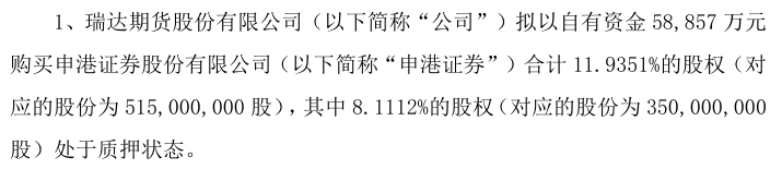 瑞达期货拟收购申港证券11.94%股权 其中8.11%股权处于质押状态