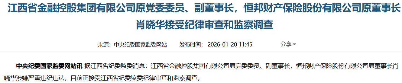 1月20日,据江西省纪委监委消息,江西省金融控股集团有限公司原党委委员、副董事长,恒邦财产保险股份有限公司(以下简称“恒邦财险”)原董事长肖晓华涉嫌严重违纪违法,目前正接受江西省纪委监委纪律审查和监察调查。