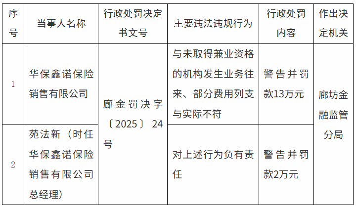 1月20日,廊坊金融监管分局发布的行政处罚信息公开表显示,华保鑫诺保险销售有限公司(以下简称“华保鑫诺保险销售”)因与未取得兼业资格的机构发生业务往来、部分费用列支与实际不符,被警告并被罚款13万元。时任公司总经理苑法新因对上述行为负有责任,被警告并被罚款2万元。