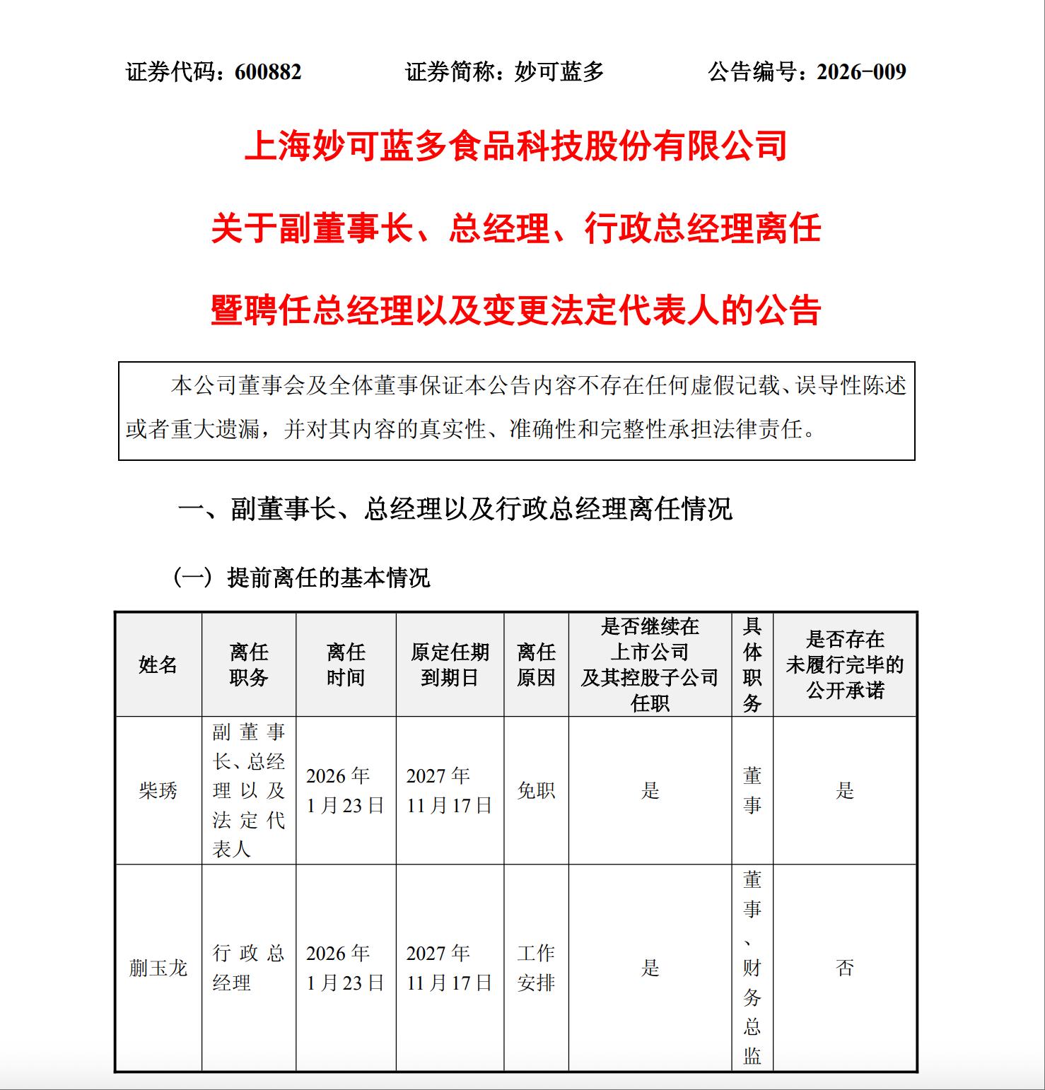 1月25日晚,妙可蓝多发布公告称,公司副董事长、总经理以及法定代表人柴琇被免职,行政总经理蒯玉龙接任总经理一职,并担任公司法定代表人。
