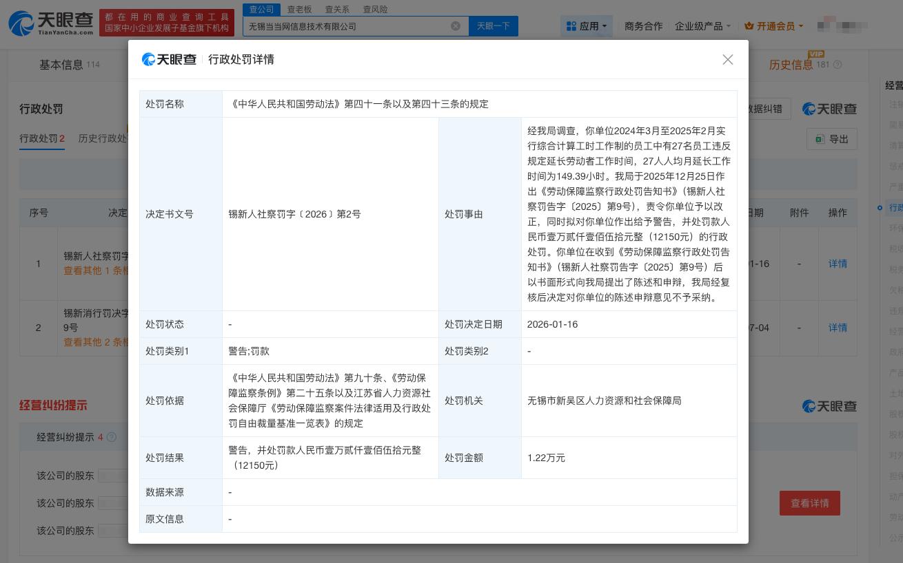 天眼查显示,无锡当当网信息技术有限公司(以下简称“无锡当当网”)因违反劳动法相关规定,被无锡市新吴区人力资源和社会保障局处以警告,并处以罚款12150元,处罚决定日期为2026年1月16日。