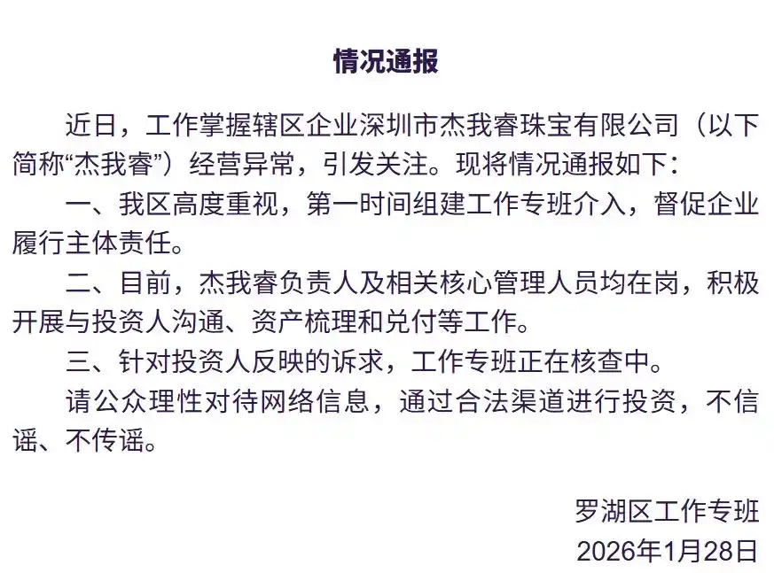 1月28日,深圳市罗湖区工作专班发布通报,确认辖区企业深圳市杰我睿珠宝有限公司(以下简称“杰我睿”)出现经营异常。官方表示,已第一时间组建工作专班介入,督促企业履行主体责任。目前,杰我睿负责人及相关核心管理人员均在岗,正积极开展与投资人沟通、资产梳理和兑付工作。